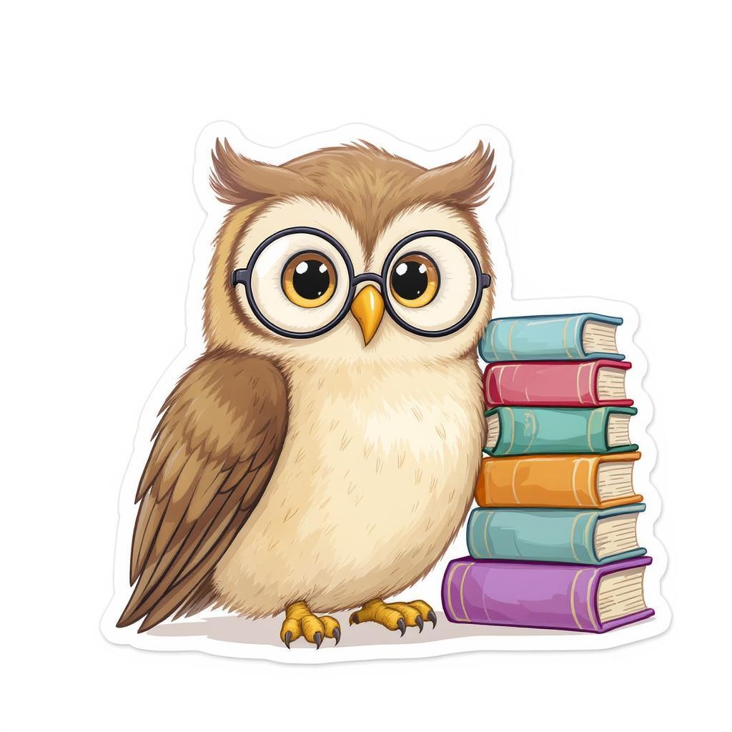 A wise owl sporting round spectacles perched beside a vibrant stack of multi-colored books, all set against a clean white backdrop in a playful, cartoonish style. Its feathers are subtly hued in shades of cream and brown, with hints of gold, and its eyes twinkle with curiosity as it peers through the lenses.