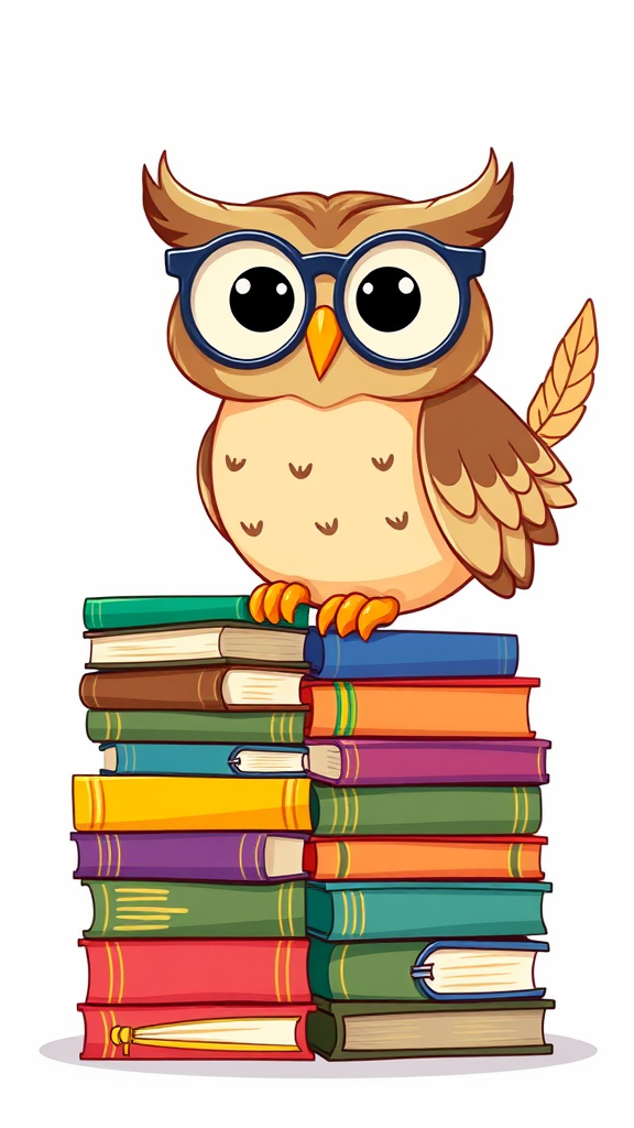 A wise owl with round spectacles perched beside a stack of colorful, diverse books, set against a clean, white backdrop in a playful, cartoon style, with the owl playfully balancing a quill on one of its wings.