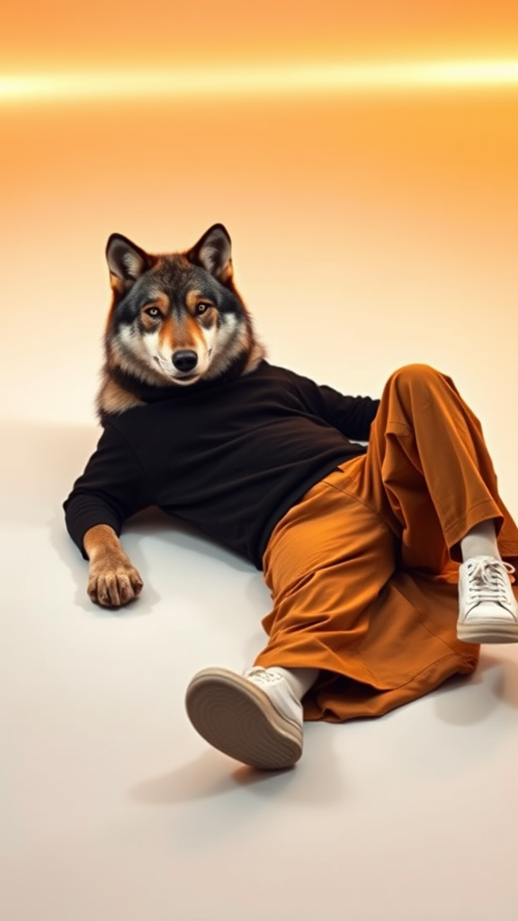 A wolf casually reclines on a sleek, minimalist white floor, donning a chic, modern black turtleneck. Its relaxed posture is accentuated by loose, stylish tan trousers and crisp white sneakers. The backdrop radiates with a soft amber glow, providing a striking contrast that amplifies the dreamlike atmosphere. This fusion of contemporary fashion with untamed essence emphasizes expression and mood.