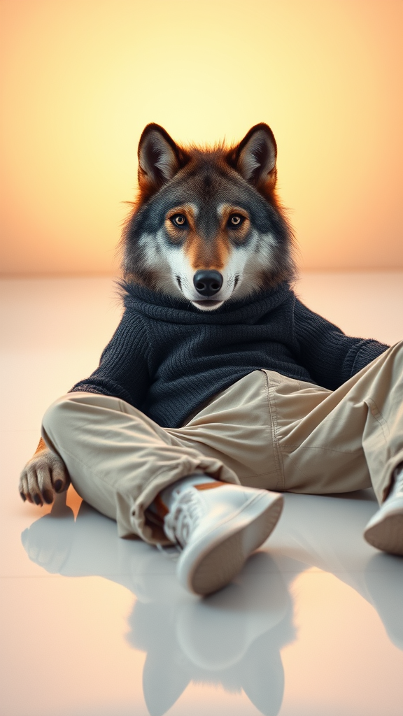 A wolf lounges effortlessly on a sleek white floor, wearing a chic charcoal turtleneck that complements its rugged demeanor. Its relaxed posture accentuates the loose-fitting beige trousers and crisp white sneakers. The backdrop radiates with a soft amber glow, providing a striking contrast that accentuates the scene's surreal essence. This fusion of contemporary fashion and untamed nature focuses on the wolf's expressive eyes and tranquil mood, embodying both urban sophistication and primal spirit.