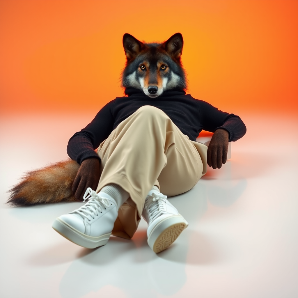 A wolf lounges nonchalantly on a sleek white floor, dressed in a chic dark turtleneck that hugs its frame. Its relaxed stance showcases loose-fitting beige trousers and pristine white sneakers, exuding an effortless style. The backdrop radiates a rich amber glow, providing a striking contrast that heightens the fantastical mood. This combination of modern fashion and untamed essence emphasizes the wolf's expressive and free-spirited demeanor.