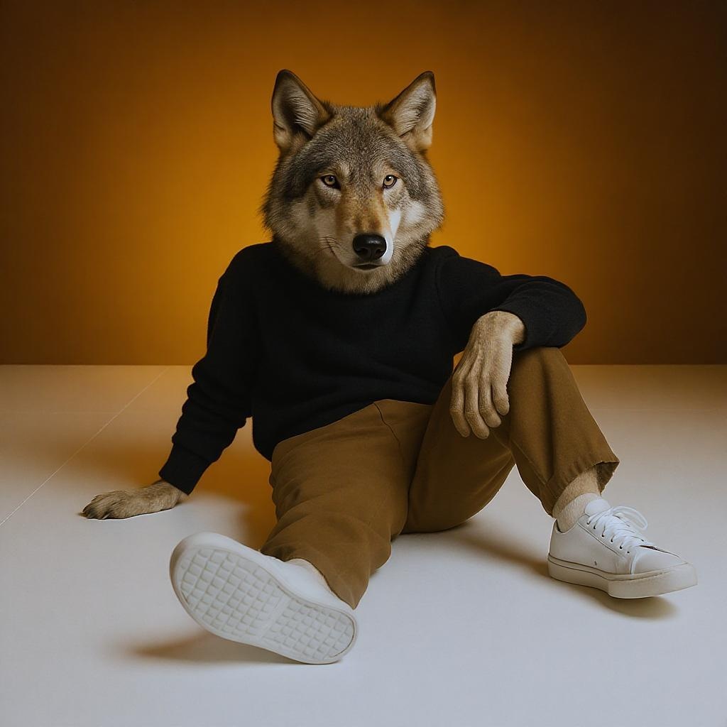 A wolf reclines comfortably on a sleek, minimalist white floor, wearing a stylishly realistic dark turtleneck. Its nonchalant posture emphasizes loose-fitting brown trousers paired with crisp white sneakers. The background radiates a warm amber glow, providing a striking contrast that amplifies the surreal ambiance. This fusion of urban fashion and untamed spirit is captured through a focus on expression and mood, with subtle nuances enhancing the wild yet sophisticated essence.
