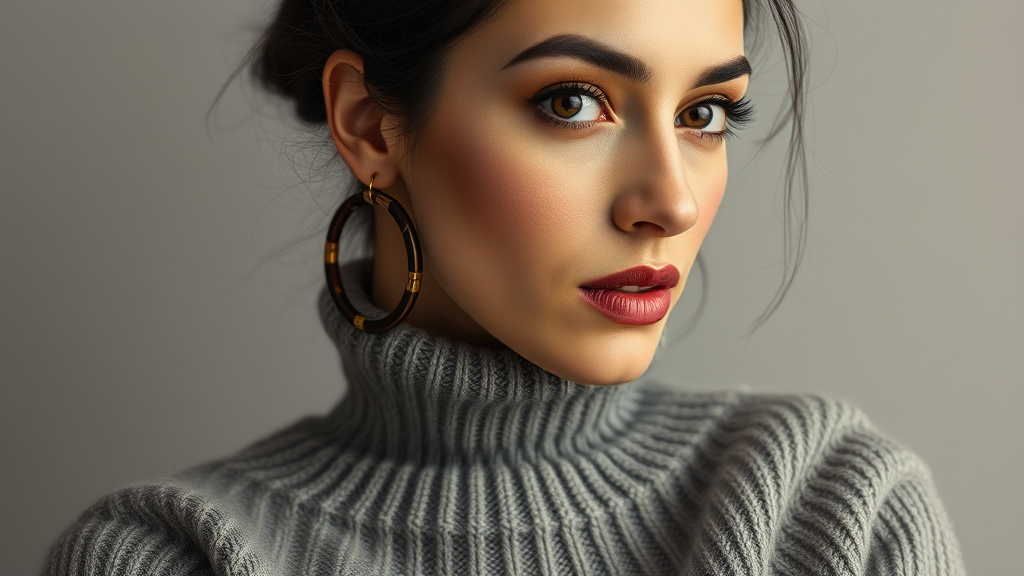 A woman adorned in a cozy sweater and elegant brown hoop earrings, capturing the essence of Shirin Neshat's style with graceful curves and a palette of soft silver and gray. Her strong facial expression reminiscent of candid celebrity shots exudes power and confidence. Inspired by Penelope Rosemont, the scene blends elements of folk and naïve art.