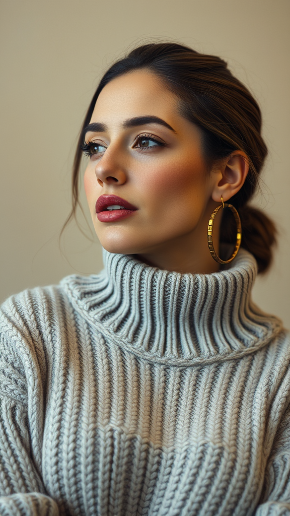A woman adorned in a cozy sweater and elegant brown hoop earrings, evoking the essence of Shirin Neshat's style, with graceful curves highlighted in soft silver and light gray tones. Captured in a candid moment reminiscent of celebrity snapshots, her expression is both strong and captivating. The scene incorporates elements of Penelope Rosemont's influence, blending a touch of folk and naïve art.
