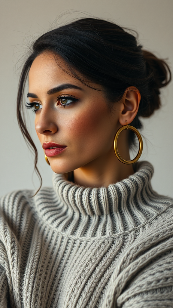 A woman adorned in a cozy sweater and elegant brown hoop earrings, embodying the artistic essence of Shirin Neshat, featuring graceful curves and a palette of light silver and gray tones. Captured with the candid authenticity of celebrity shots, reminiscent of the style of Penelope Rosemont. Her facial expression conveys strength and resilience, drawing inspiration from folk and naïve art.