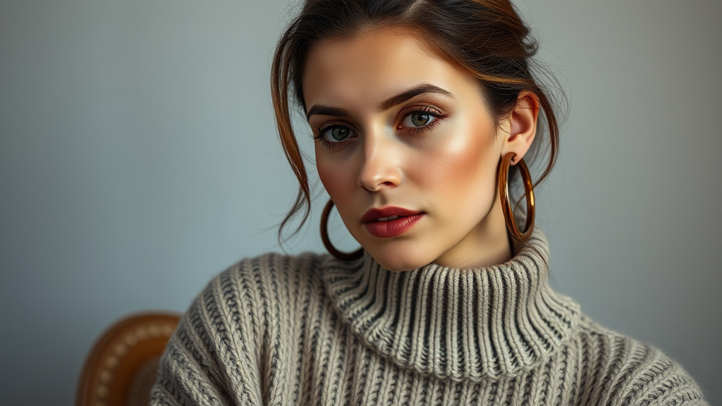 A woman adorned in a cozy sweater paired with earthy brown hoop earrings, captured in the evocative style reminiscent of Shirin Neshat, embodying graceful curves with a palette of light silver and subtle gray hues. The image is a candid yet enigmatic celebrity shot, echoing the creative essence of Penelope Rosemont, showcasing a strong and captivating facial expression, interwoven with elements of folk and naïve artistry.