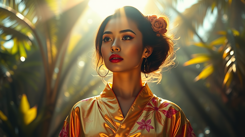 A woman adorned in a lustrous, glossy golden kimono stands bathed in radiant sunlight, embodying the essence of cyberpunk realism. She's set against a backdrop of enigmatic tropics, vibrant with light and energy, drawing from the glamorous allure of Hollywood's photorealistic portraits. Her presence is a stunning blend of detailed character illustration and digital neon, inspired by the likes of Artgerm and Wong Kar-wai. The metallic sheen of her attire shimmers with close-up intensity, creating an explosive visual impact. This scene is crafted in the style of digital manipulation, echoing the vivid artistry of Tanya Shatseva and the emotive depth of Daniel F. Gerhartz. The palette is a dance of dark pink and light blue, with intricate imagery capturing every nuance, resulting in an ultra-high-definition masterpiece.