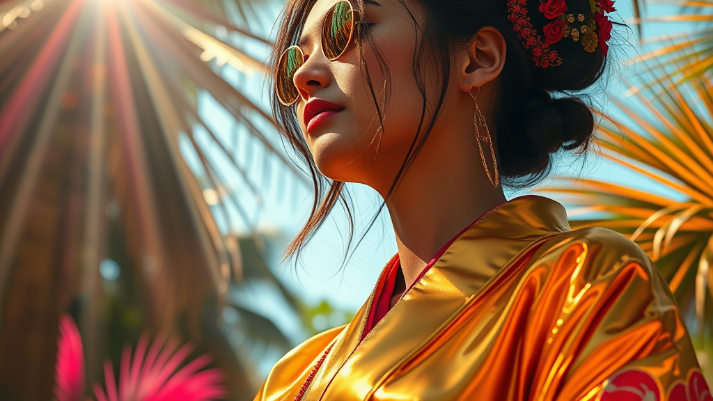 A woman adorned in a radiant, glossy gold kimono basks in sunlight, embodying a fusion of cyberpunk realism and the vibrant tropics. Her presence is akin to a glamorous Hollywood portrait, rich in photorealistic detail and character illustration. The scene pulses with digital neon accents, echoing the artistic styles of Artgerm and Wong Kar-wai. The kimono's metallic sheen catches the eye with close-up intensity, set against a backdrop where rays of light explode with dynamic force. The composition, reminiscent of digital manipulation, draws inspiration from Tanya Shatseva and Daniel F. Gerhartz, featuring a harmonious blend of dark pink and light blue tones. This intricately crafted imagery, captured in ultra-high definition, embraces the captivating allure of enigmatic tropics interwoven with futuristic elements.