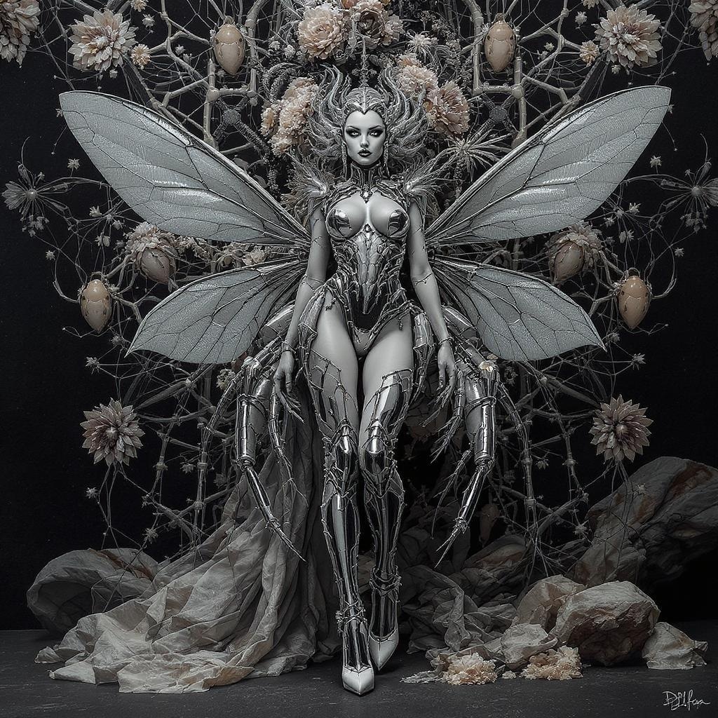 A woman adorned in a shimmering chrome vest paired with a unique costume and avant-garde shoes, embodying the essence of cybernetic surrealism and womancore. The scene presents realistic renderings of the human form intricately composed of insects, set against a palette of dark white and light black hues. This captivating vision is infused with elements of flowerpunk, where organic forms blend seamlessly with futuristic aesthetics, creating a harmonious fusion of nature and technology.