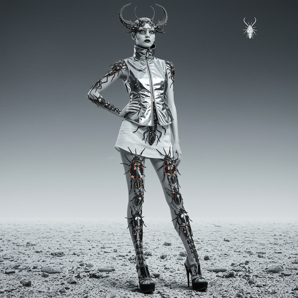 A woman adorned in a sleek chrome vest paired with an avant-garde ensemble and futuristic shoes, embodying the essence of cybernetic surrealism. Her appearance blurs the lines between womancore fashion and intricate realism, where her form is a mesmerizing assembly of intricate insects. Draped in shades of dark white and light black, she exists in a world touched by the whimsy of flowerpunk. The scene is a vivid exploration of contrasts and harmony, inviting the viewer to a realm where the organic and the mechanical converge in an awe-inspiring spectacle.