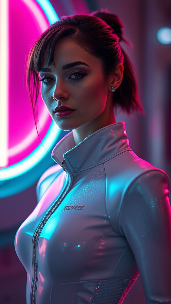A woman adorned in a sleek futuristic ensemble stands poised before a vibrant neon glow, her attire a blend of white and cyan, intricately detailed with greeble-like textures. Her expression exudes timeless grace, reminiscent of the ethereal style of Evgeni Gordiets. Every aspect of her appearance is rendered with blink-and-you-miss-it detail, as if bordering on the realm of otherworldly beings. The atmosphere is subtly enhanced with an aura of surrealism and intrigue, capturing the eye with its striking blend of hyper-realism and imaginative design.