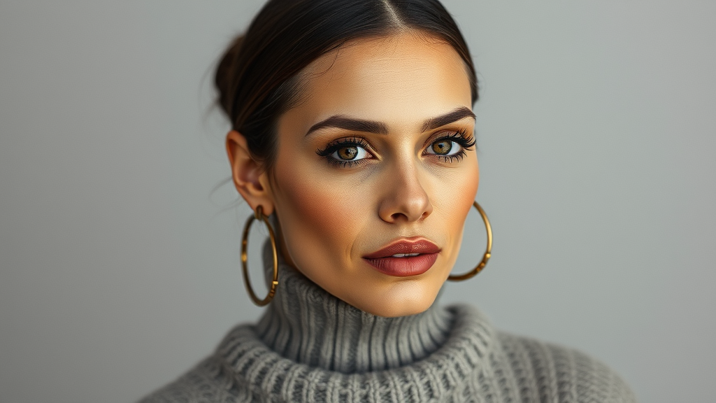 A woman adorned in a sweater with earthy brown hoop earrings, captured in the evocative style reminiscent of Shirin Neshat, featuring elegant and graceful lines. The palette is dominated by light silver and soft gray hues, evoking the candid yet striking aura observed in celebrity portraits. Her presence is imbued with a strong and expressive facial demeanor, echoing the folk and naïve art influences attributed to Penelope Rosemont. The composition balances artistic nuance and contemporary charm, creating an image that is both intimate and powerful.