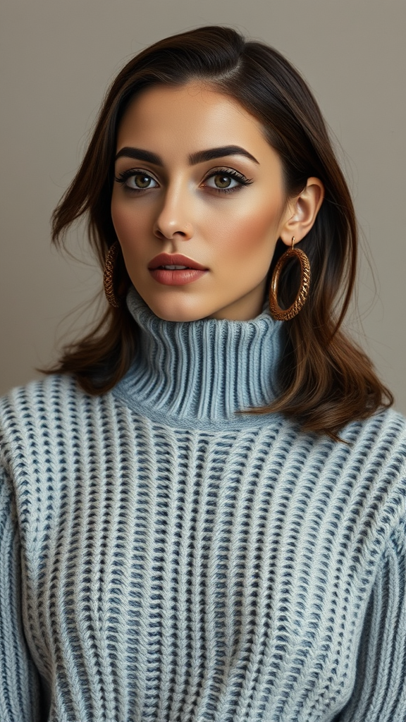 A woman adorned in a textured sweater and elegant brown hoop earrings, embodying the essence of Shirin Neshat's style. Her form is defined by graceful curves and a palette of soft silver and gray, reminiscent of candid celebrity shots. Channeling the expressive intensity of Penelope Rosemont's work, her strong facial expression captivates. The scene carries a folk/naïve aesthetic, with a harmonious blend of simplicity and depth.
