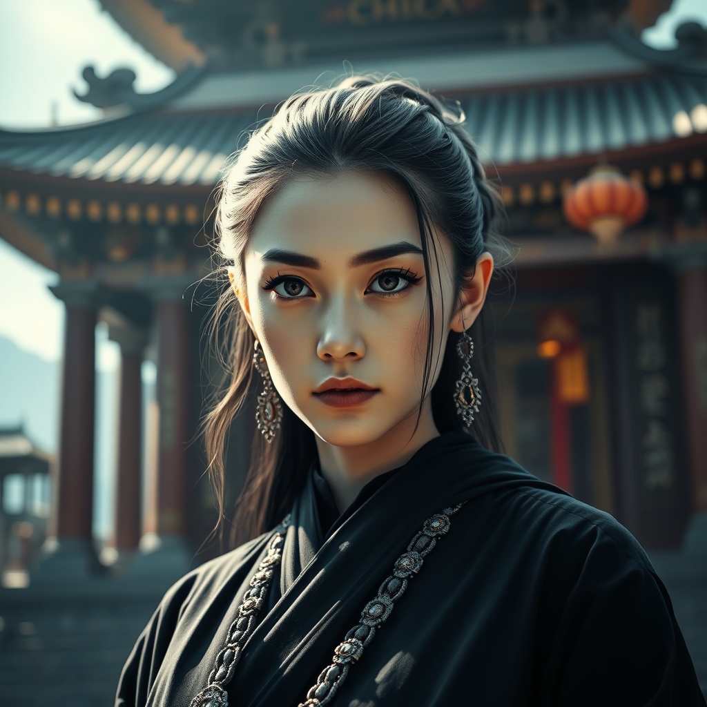 A woman, adorned in dark robes, stands against a temple backdrop. Her eyes are symmetrical, and the scene is enveloped in dramatic lighting that highlights the realistic details. The focus is sharp, providing an HD, hyperrealistic effect captured through advanced photography techniques. Complex and intricate details are evident, enhanced by physics-based rendering and raytracing. The high-detail RAW color photo is ultra-high resolution, designed for an 8K wallpaper aesthetic. The subject is embellished with finely crafted jewelry, adding to the CGI and 3D elements. Artistic influences of anime, illustration, and digital painting blend seamlessly. The image avoids low quality issues, ensuring no artifacts, errors, or distortions, maintaining perfect anatomy and proportions throughout.
