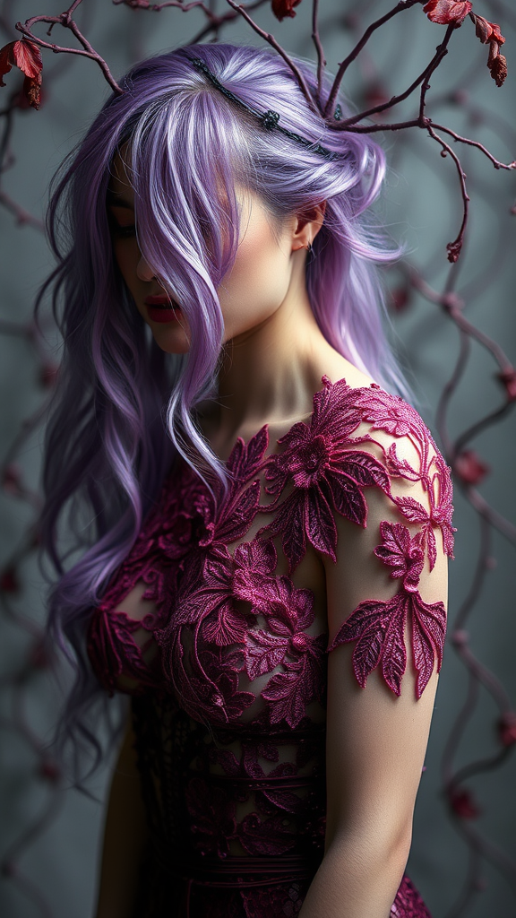 A woman adorned in intricate pink metal lace, her hair shimmering with a subtle purple dye, nestled in a world of dark whites and deep reds. Her appearance is a work of process art, echoing the organic materials she's intertwined with, featuring body extensions that flow seamlessly. The elements are brought together with a wet-on-wet blending technique, where silver and maroon hues intermingle, creating a mesmerizing visual dance, inspired by the artistic style of Mandy Jurgens.