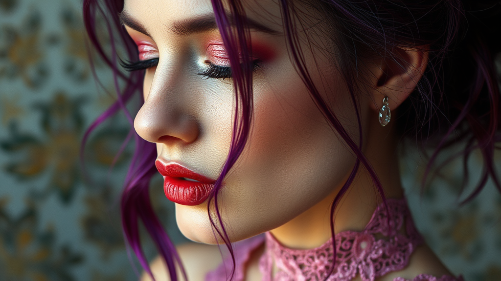a woman adorned in pink metallic lace, her hair dyed in deep violet hues, portrayed in shades of dark ivory and crimson, inspired by process art and the works of mandy jurgens, featuring natural elements and body extensions, with a wet-on-wet blending technique, accented by silver and maroon tones, in an aspect ratio of 4:5 with a raw and unrefined style