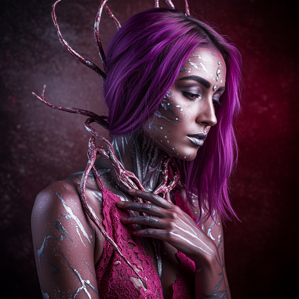 A woman adorned in pink metallic lace, her hair dyed in a vibrant shade of purple, set against a backdrop of dark white and deep red hues. Embracing the essence of process art and the visionary style of Mandy Jurgens, she embodies organic elements with intricate body extensions. The composition reveals a harmonious blend of wet-on-wet techniques, shimmering in silver and maroon tones, capturing a raw and unrefined aesthetic.