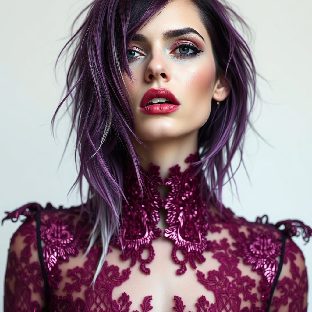 A woman adorned in pink metallic lace with her hair infused in deep purple dye, exuding a dark white and crimson essence, inspired by process art and Mandy Jurgens. Her ensemble and extensions are crafted from organic materials, with fluid wet-on-wet blending techniques in silver and maroon hues, creating a raw, avant-garde appearance.