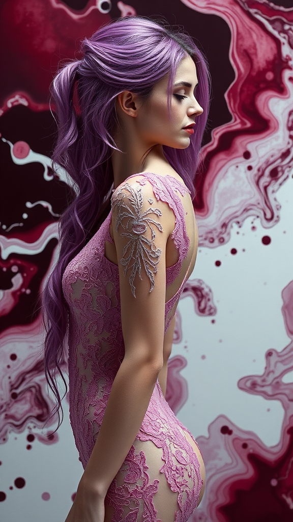 A woman adorned in pink metallic lace with hints of purple dye cascading through her hair, set against a backdrop of dark white and deep crimson hues. The scene evokes the fluid essence of process art, reminiscent of Mandy Jurgens' organic style. Her form incorporates body extensions that seamlessly blend with the lace, creating an organic yet futuristic silhouette. The use of wet-on-wet blending techniques brings her silhouette to life, with touches of silver and maroon weaving through the composition, maintaining a raw and dynamic aesthetic.