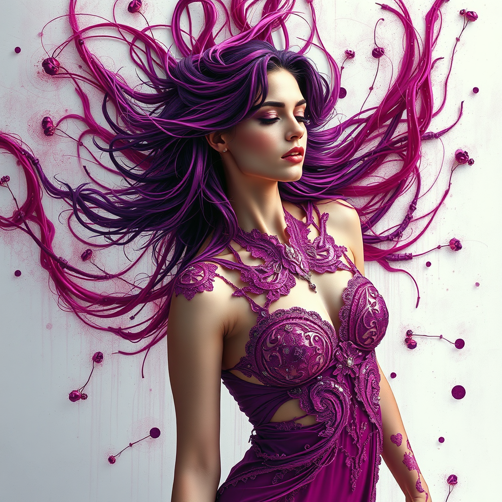 A woman adorned in shimmering pink metal lace, her hair infused with vivid streaks of purple dye, set against a backdrop of dark white and deep red tones. The scene embodies a process art style reminiscent of Mandy Jurgens, where organic materials intertwine with the figure, extending from her body in a graceful dance. Utilizing a wet-on-wet blending technique, the colors meld seamlessly, creating a fluid visual narrative. Silver and maroon elements punctuate the composition, adding depth and contrast, with a raw and unrefined style that enhances the artwork's evocative presence.