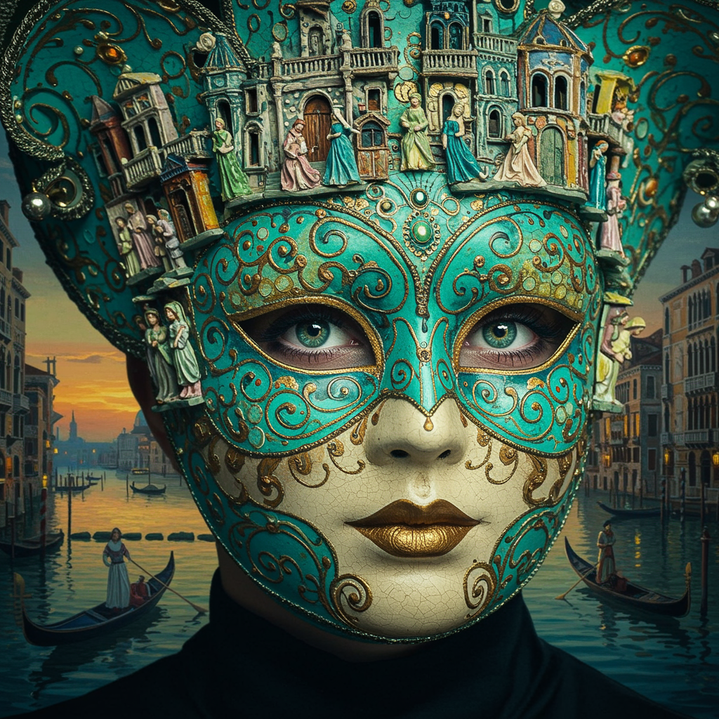 A woman adorned with an intricate mask delicately crafted with cloisonne artistry, featuring swirling patterns of turquoise and gold. Her mask is adorned with miniature sculptures depicting scenes from an impressionistic Venice, each tiny figure telling a story. Her eyes, expressive and enigmatic, peek through the detailed artwork, blending realistic fantasy with exquisite detail. The scene around her hints at a dreamlike Venice, where vibrant canals and ethereal gondolas seem to float in soft impressionistic strokes, capturing the magic of a city dipped in twilight.