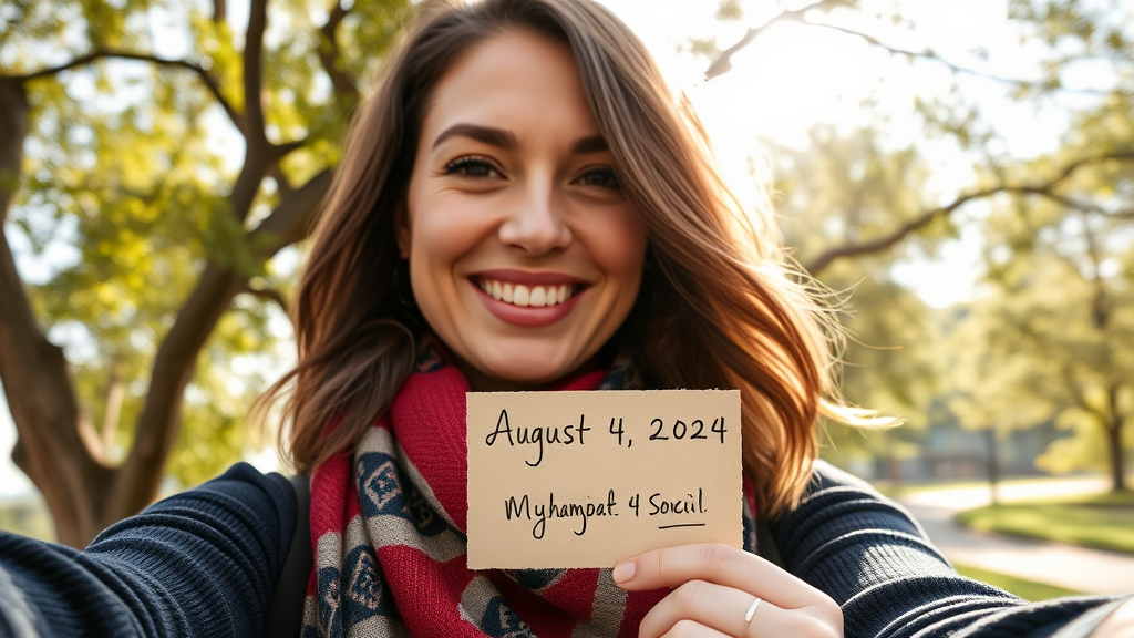 A woman captures a selfie, smiling warmly at the camera. In her hand, she holds a quaint, handwritten note displaying the date "August 4, 2024" followed by her unique social media handle. Soft sunlight filters through nearby trees in the background, casting gentle shadows while adding a natural glow to her face. Her vibrant scarf flutters slightly in the breeze, giving the snapshot a lively and spontaneous feel.