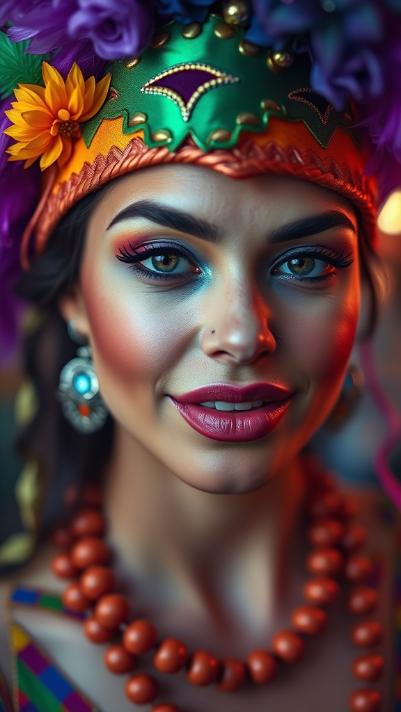 A woman celebrating Mardi Gras, adorned in vibrant, expressive colors, exuding beauty and charm while playfully engaging the viewer. It captures a striking, realistic portrait with intricate details, presenting her in a full-length frame with an 8k clarity. The scene features highly detailed, life-like skin textures, complemented by a captivating piercing. Subtle, diffused lighting creates a soft, cinematic atmosphere, with a shallow depth of field and sharp focus enhancing the hyperrealism of the image. The woman stands as a focal point against a vivid backdrop, ensuring she remains the centerpiece in this photographic masterpiece.