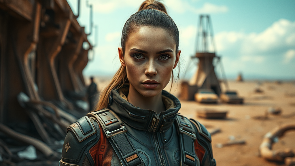A woman clad in a post-apocalyptic suit stands against a desolate backdrop, gazing directly at the camera in a portrait-style composition. Her skin is intricately detailed and appears lifelike. The image captures her in a full-length shot with an 8k resolution, showcasing high detail and vivid RAW color artistry. She has a piercing gaze, with the scene illuminated by diffused, soft lighting and a shallow depth of field, ensuring sharp focus. The cinematic lighting adds a hyper-realistic touch. Despite the chaos surrounding her, the image maintains a clear, crisp quality, avoiding any low-grade artifacts or distortions while embracing an imaginative yet eerie post-apocalyptic vibe.
