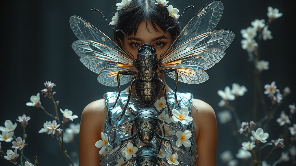 A woman clad in a reflective chrome vest, her ensemble a blend of cybernetic surrealism and womancore aesthetics. Her form is rendered with intricate realism, composed entirely of delicate, intricate insects that shimmer with a dark white and light black iridescence. The scene is infused with a flowerpunk vibe, with blossoms interwoven among the insects that form her costume and shoes, blurring the line between organic and synthetic, allowing nature and technology to coexist.