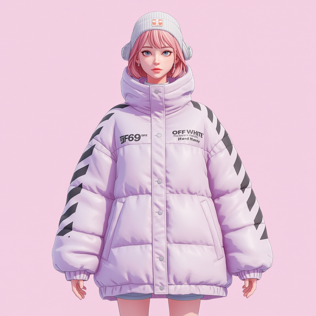 A woman donned in an oversized poncho puffer jacket reminiscent of OffWhite's signature style, blending the nostalgic charm of tumblr aesthetics with the dreamy touch of Yanjun Cheng's technique. The illustration captures the tranquil essence of the lofi girl internet meme, as if it were trending on dezeen for its style-forward appeal. Positioned as a catalog photo, this 3D-rendered piece echoes the creative exploration of artists like Beeple, Rhads, and Lois van Baarle. Embracing a cartoon style, the artwork bathes in bright pastel colors, reflecting the beauty of retro anime while incorporating fresh, imaginative elements to enhance its appeal.