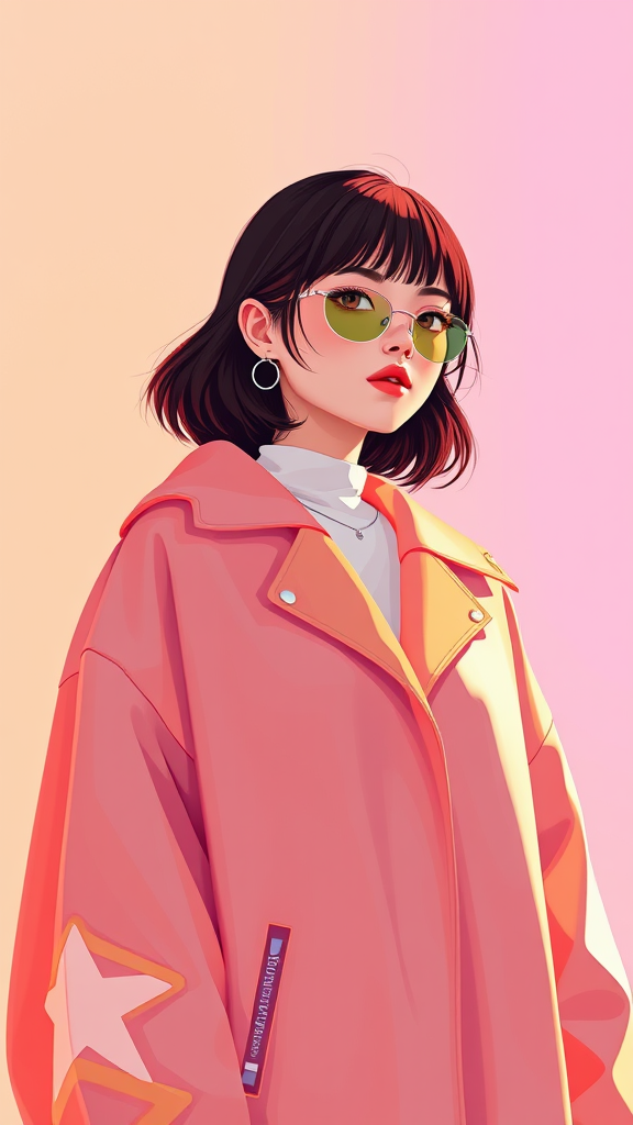 A woman dons a sleek modern poncho jacket, reminiscent of Duro Olowu's vibrant designs. Her style blends the nostalgic essence of Yanjun Cheng's influence with a digital art flair, echoing the lofi girl internet meme. This visually captivating scene trends on Dezeen, capturing the eye with its catalog photo aesthetic. The illustration, a 3D render inspired by Beeple, Rhads, and Lois van Baarle, bursts with bright pastel hues. It portrays a futuristic anime-inspired girl in a cartoon-style illustration, where retro meets contemporary, creating a beautiful artwork that feels both innovative and timeless.