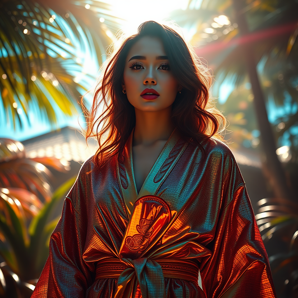 A woman draped in a shimmering golden kimono stands in the radiant sunlight, exuding an aura of cyberpunk realism against an enigmatic tropical backdrop bathed in luminescence. She embodies the allure of glamorous Hollywood, captured in photorealistic clarity with intricate detailing and powerful character presence. The composition gleams with digital neon hues, echoing the styles of Artgerm and Wong Kar-wai, while metallic elements reflect close-up intensity. The scene is dynamic and vibrant, with rays bursting through in a fantastical display. Inspired by digital manipulation techniques reminiscent of Tanya Shatseva and Daniel F. Gerhartz, the palette is rich in dark pinks and light blues, creating intricate and vivid imagery in ultra-high definition.
