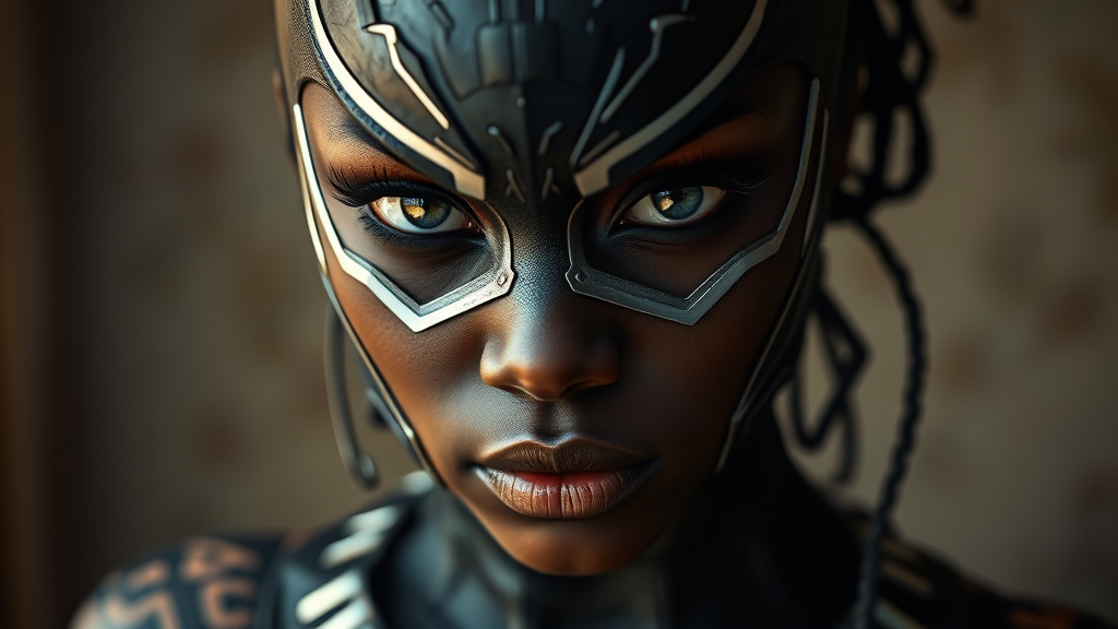 A woman dressed as a BLACK PANTHER, with tattoos, gazes confidently at the viewer. The portrait captures her in detailed, realistic photography with a focus on lifelike skin textures. Shot in 8k resolution, the highly detailed image presents her full length in a frame. The raw color art portrays a striking presence, enhanced by piercing eyes and diffused soft lighting. The shallow depth of field and sharp focus contribute to the sense of hyperrealism, complemented by cinematic lighting. The overall aesthetic is immaculate with no visual errors or low-quality elements. There are no distractions such as text, artifacts, or unnatural distortions; the image avoids any depiction of abnormalities, maintaining perfect anatomy and proportions with no extra limbs or disfiguration. Her form is gracefully contained within the frame, preserving a perfect balance between artistically styled elegance and strength.