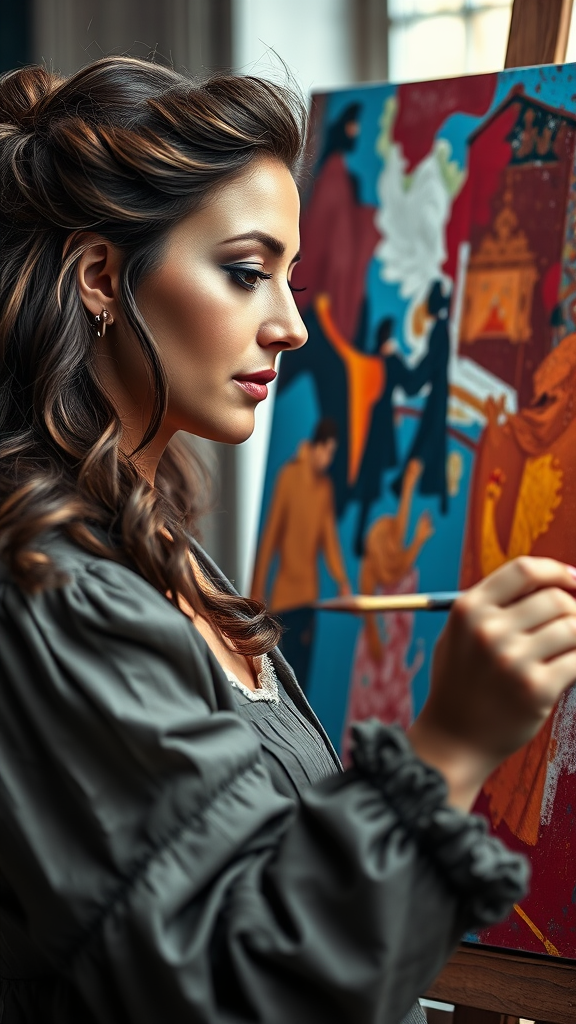 A woman dressed as a classic French artist passionately painting a vibrant canvas, capturing the spirit of a painter. The scene is in portrait format, with detailed skin tones and a lifelike photo-realistic quality. Shot in 8k resolution, the image is highly detailed, showing her full-length frame. The colors are high detail RAW, complemented by subtle piercings and set in diffused soft lighting. The photograph uses a shallow depth of field and sharp focus, revealing hyperrealistic and cinematic CGI lighting effects. The entire setup avoids any low quality or distorted features, maintaining only the essential elements that depict her artistic essence accurately, without any unwanted artifacts or errors. The artist has a natural pose with balanced proportions and expressions that are realistically captured, emphasizing her identity as a creative soul in her studio, guiding viewers into her world of artistic insight and dedication.