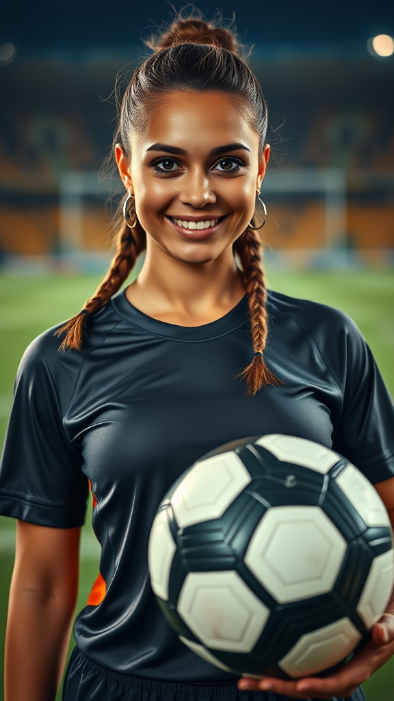 A woman dressed as a soccer player stands confidently with a soccer ball, smiling at the camera. She's wearing a sporty yet stylish outfit with a football pitch in the background. Her portrait conveys realism with a detailed depiction of her skin, captured in a full-length frame. The photography is executed in 8k resolution with high detail and rich, raw colors, accentuated by her piercing gaze. The lighting is soft and diffused, creating a shallow depth of field with sharp focus, embodying hyperrealism and cinematic appeal. Avoiding common photographic pitfalls, the image maintains excellent quality without low-grade artifacts or errors like duplicates or deformations, capturing her form with accurate anatomy and proportions. Subtle creative touches enhance the core visual narrative, presenting a polished yet dynamic portrayal without any distractions such as watermarks or text.