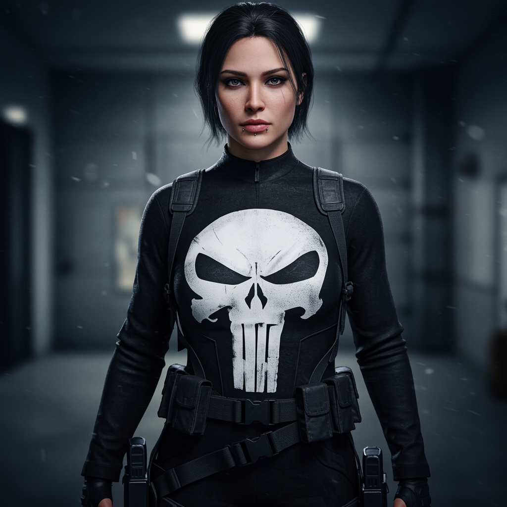 A woman dressed as the Punisher stands confidently, gazing directly at the camera. The portrait captures her with flawless, detailed skin and a realistic, photo-realistic quality, presented in 8k resolution. The full-length frame showcases highly detailed, vivid RAW colors, complemented by a subtle piercing that adds character. The scene is illuminated with diffused soft lighting and sharp focus, achieving hyperrealism with cinematic lighting effects. Despite the low resolution indicated, the image maintains integrity, avoiding text errors, cropped or duplicated visuals. There are no signs of jpeg artifacts or poor quality; the composition excludes unsightly elements like morbid or mutilated features. The subject's anatomy is proportionate, with no extra or missing limbs, ensuring a natural depiction. The artwork is free from usernames, watermarks, or signatures, focusing entirely on the captivating visual narrative.
