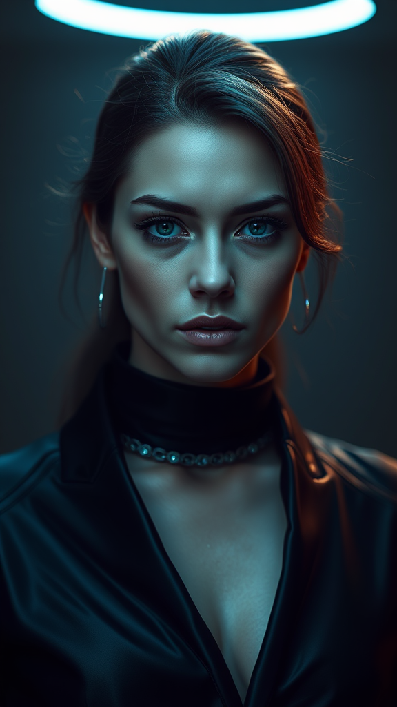 A woman dressed in a sleek, modern interpretation of the invisible woman, standing confidently and gazing intently at the viewer in a striking portrait setting. The photography showcases her detailed and realistic skin texture, captured in ultra-high definition 8k resolution. The image features highly detailed, full-length composition with RAW color art, emphasizing her piercing gaze. The scene is bathed in diffused, soft lighting with a shallow depth of field to create a hyperrealistic effect. Cinematic lighting enhances the mood, bringing her features into sharp focus while maintaining a sense of intimacy. Despite the realism, there are subtle artistic choices that play with the concept of invisibility, such as faint outlines or translucent elements in her attire. The piece remains clear of common photographic distractions, ensuring refined quality without distortions or artifacts.