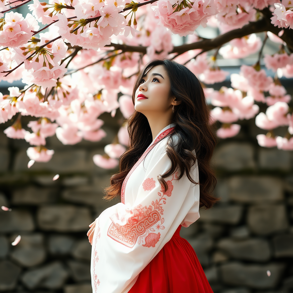 A woman dressed in a traditional Chinese Hanfu, featuring a white robe with intricate red and black patterns on the sleeves, and a flowing red skirt, stands gracefully beneath a blooming pink cherry blossom tree. Her wavy hair cascades softly around her serene face as she gazes dreamily upward, her eyes exuding contentment and peace. Cherry blossom petals drift lazily through the air, adding to the scene's gentle grace. Behind her, a weathered stone wall enhances the timeless ambiance. The entire setting is bathed in gentle, diffused sunlight, enveloping the scene in a tranquil mood with a soft pastel palette and a touch of nostalgic film grain.
