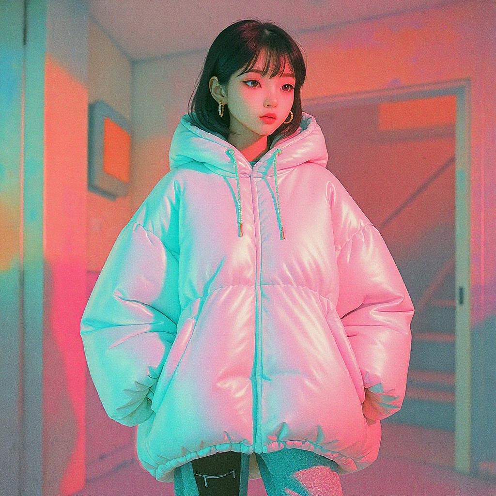A woman dressed in an oversized poncho puffer jacket, reminiscent of OffWhite, evokes the essence of Tumblr aesthetics, inspired by Yanjun Cheng. Digital art merges with the lofi girl internet meme, appearing as if trending on Dezeen. The scene is captured as a catalog photo with influences from 3D renderings by Beeple, while drawing upon styles from Rhads and Lois van Baarle. The illustration, cartoonish in nature, is awash in bright pastel colors, presenting a stunning artwork that channels a retro anime girl vibe.