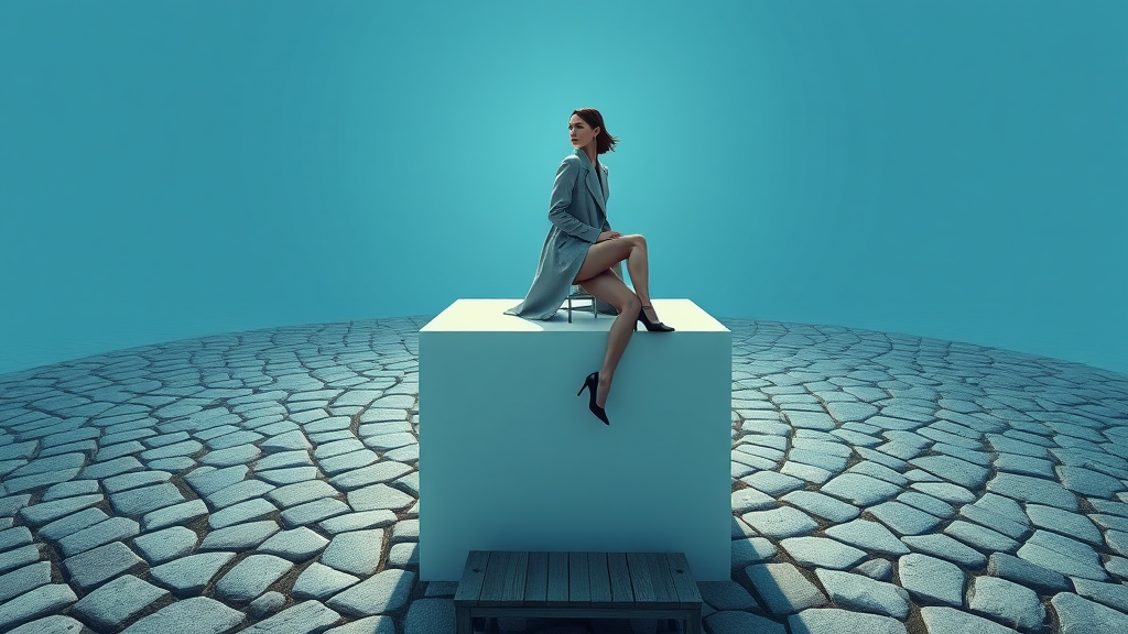 A woman elegantly perched atop a pristine white cube, exuding the minimalist elegance of a Jil Sander editorial. Enveloped in harmonious blue and grey tones, the scene radiates a serene yet captivating aura reminiscent of trending aesthetics on platforms like InterfaceLIFT. She wears a sleek coat, her beauty strikingly apparent through her long, slim legs, reminiscent of an artful fusion between Zhang Shuqi's delicate style and the evocative essence of Peter Mohrbacher's artistry. The composition is set against a backdrop of textured flagstones, adding depth to the visual narrative. Her tall and slender silhouette is accentuated by modern attire befitting the pages of Harper’s Bazaar, with subtle nods to Jeongseok Lee's creative touch. The scene incorporates rustic elements like wooden platforms, all composed in a round-cropped, contemporary 2014-inspired frame.