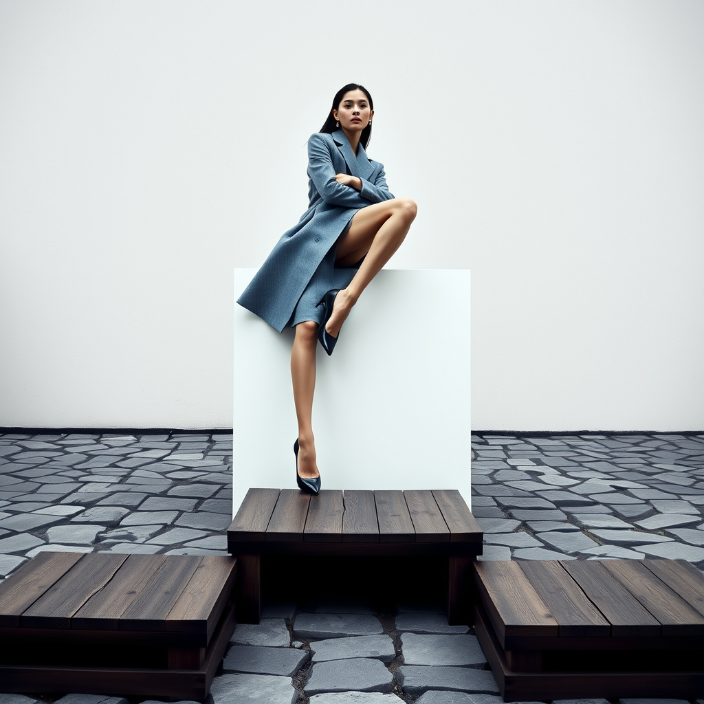 A woman elegantly perched atop a sleek white cube, evoking the minimalist allure of a Jil Sander editorial. Enveloped in a coat that speaks of modern grace, she embodies the serene hues of blue and grey tones echoed in a trending Interfacelift aesthetic. Her exceptionally beautiful long, slim legs exude a Zhang Shuqi-inspired elegance, set against the textured backdrop of weathered flagstones. Her posture is tall and slender, reminiscent of Peter Mohrbacher's ethereal style. The setting features wooden platforms that ground the scene, with a round-cropped composition, capturing the timeless elegance of 2014. Modern attire fitting for a Harper's Bazaar spread, influenced by Jeongseok Lee's artistic vision.