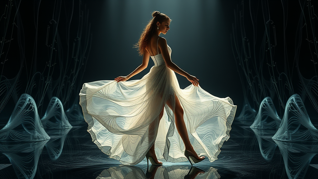 A woman elegantly poised in a darkened room, her skirt and dress fusing seamlessly with the ambiance, reminiscent of translucent resin waves. The setting reflects technological symmetry with thin steel forms and intricate patterning. Her attire features detailed costumes woven with precision, captured in the clarity akin to a Ricoh GR III. She embodies a figura serpentinata stance, showcasing graceful fluidity and movement. The scene is composed with an aspect ratio of 125:156, offering a raw and unfiltered style that enhances the ethereal quality.