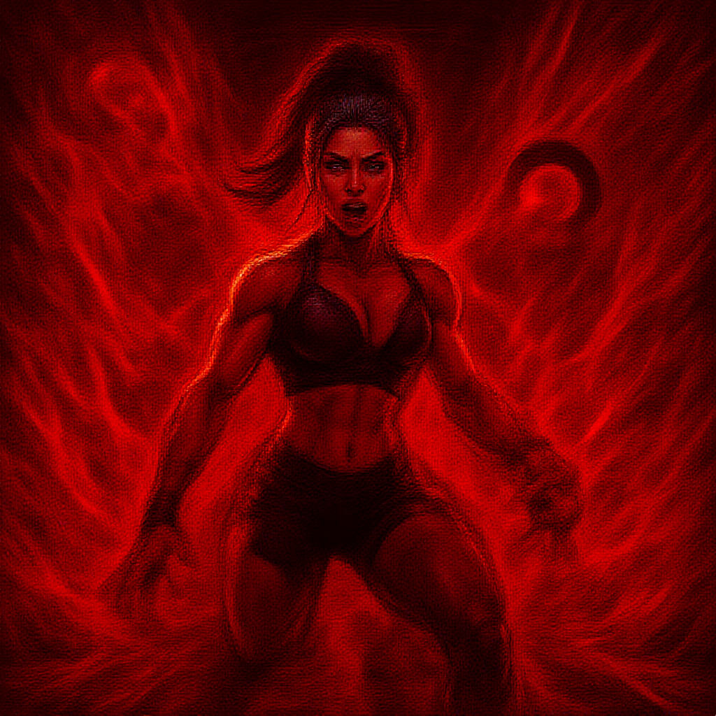 A woman engaged in intense fitness training in a futuristic gym, with galactic themes integrated into the setting. Elements of fiery energy surround her, reminiscent of satellite imagery. The style echoes Yoji Shinkawa's dynamic illustrations, infused with neon red hues. The environment includes textures and details akin to spun cotton, blending seamlessly with advanced technology. This scene emphasizes a balance between human strength and cosmic elements, set against a vibrant, stylized backdrop.