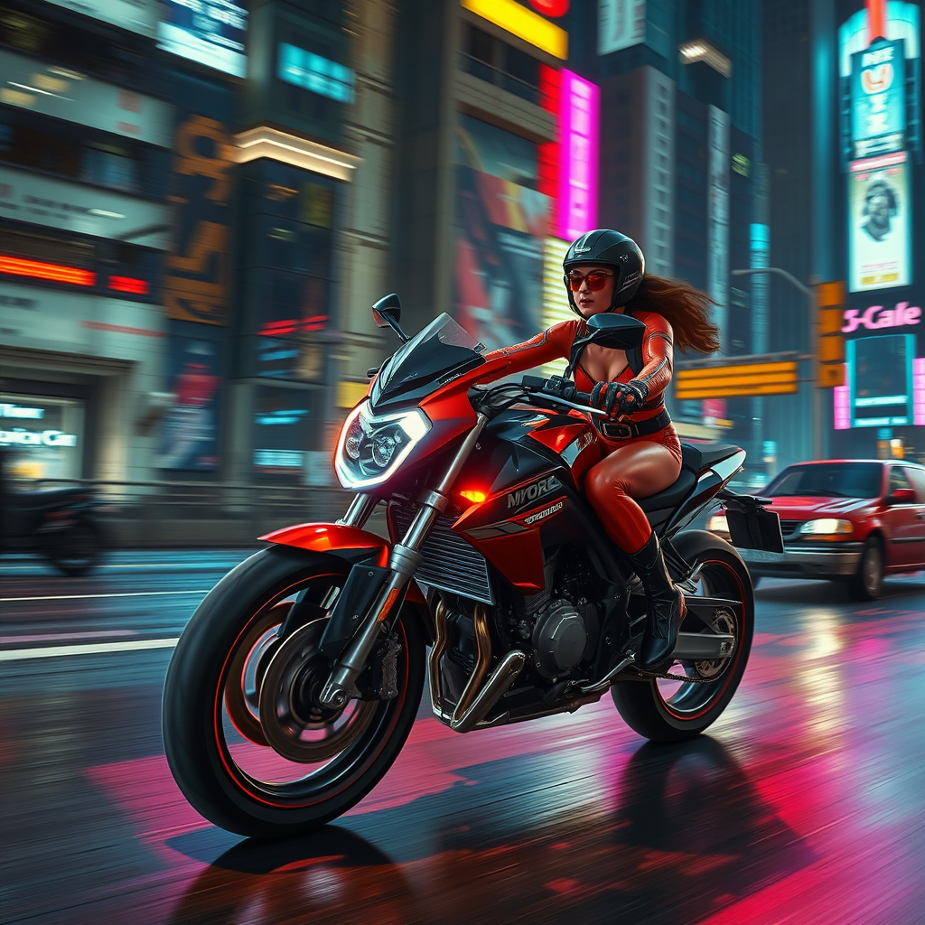 A woman expertly maneuvers a sleek motorcycle during a high-speed chase through a sprawling cyberpunk cityscape. The neon glow of colorful lights dances across her bike as she weaves through traffic, her tight-fitting red and black gear glistening under the city’s vibrant glow. The world blurs around her, enhanced by a motion blur virtual effect, as she races through the city streets at night. The scene is tense and suspenseful, captured with dramatic lighting that casts sharp shadows across the wet pavement. This action-packed moment is immortalized in a photo-realistic, high-resolution painting, with a slight film grain lending a cinematic quality. The artwork is a masterpiece of illustration and concept art, vivid in color and detail, with an intense focus on realism and energy.