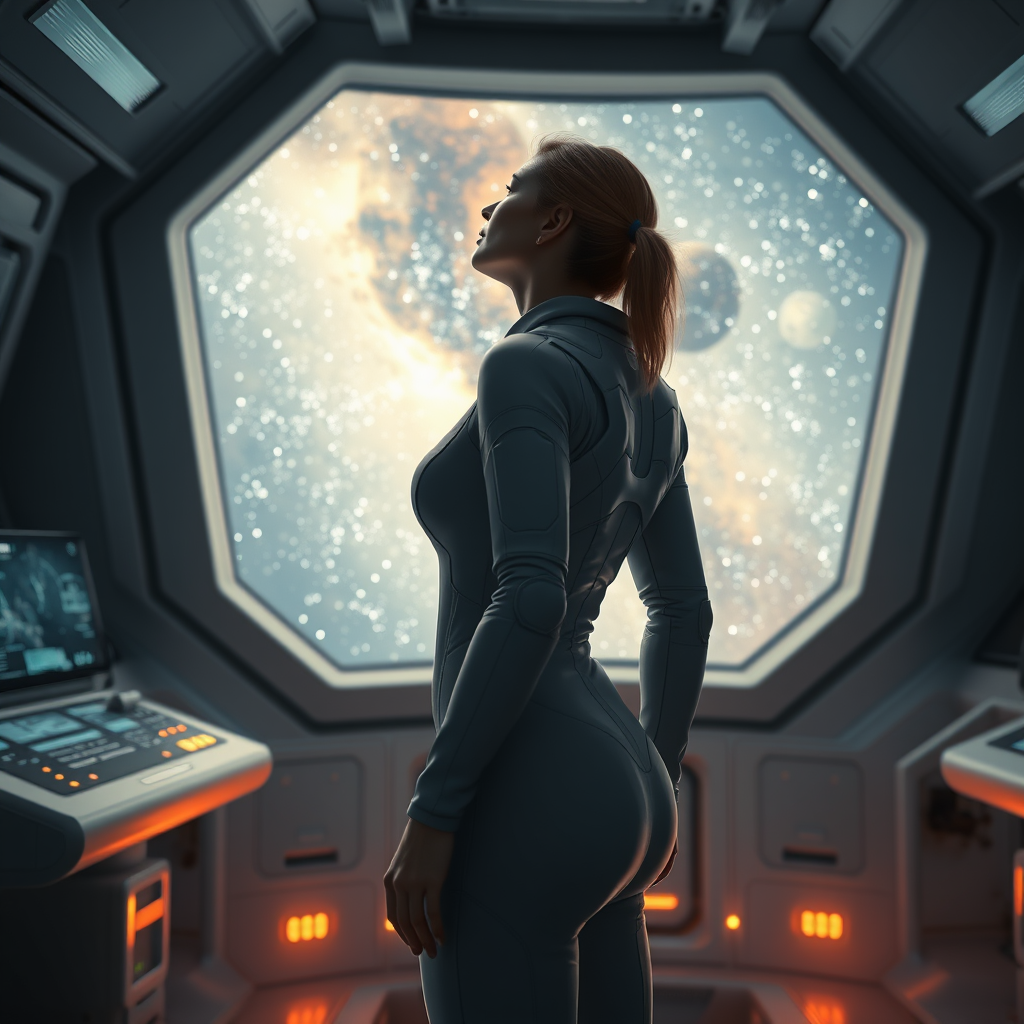A woman gazes at the vast cosmos, wearing a sleek, modern flight suit, standing within a state-of-the-art space station. The room is softly illuminated by holographic controls and large observation windows. The scene blends reality and imagination, with CGI visual effects that create a stunning, dreamlike visualization, reminiscent of a hyper-realistic digital painting or a masterful illustration. The futuristic environment, combined with the stars' twinkling outside, evokes a sense of wonder and boundless exploration.