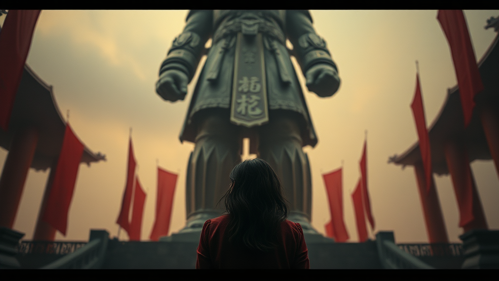 A woman gazes up at a colossal statue, immersed in the grandeur of a cinematic set, drawing inspiration from the styles of Fenghua Zhong and Alessio Albi. The scene unveils a blend of red and gray tones, reminiscent of Cliff Chiang's artistic flair. The air hums with a filmic quality, each detail crafted with meticulous technique, evoking a sense of awe and storytelling. The statue, imposing and enigmatic, serves as both a guardian and a mystery amidst this vivid tableau.