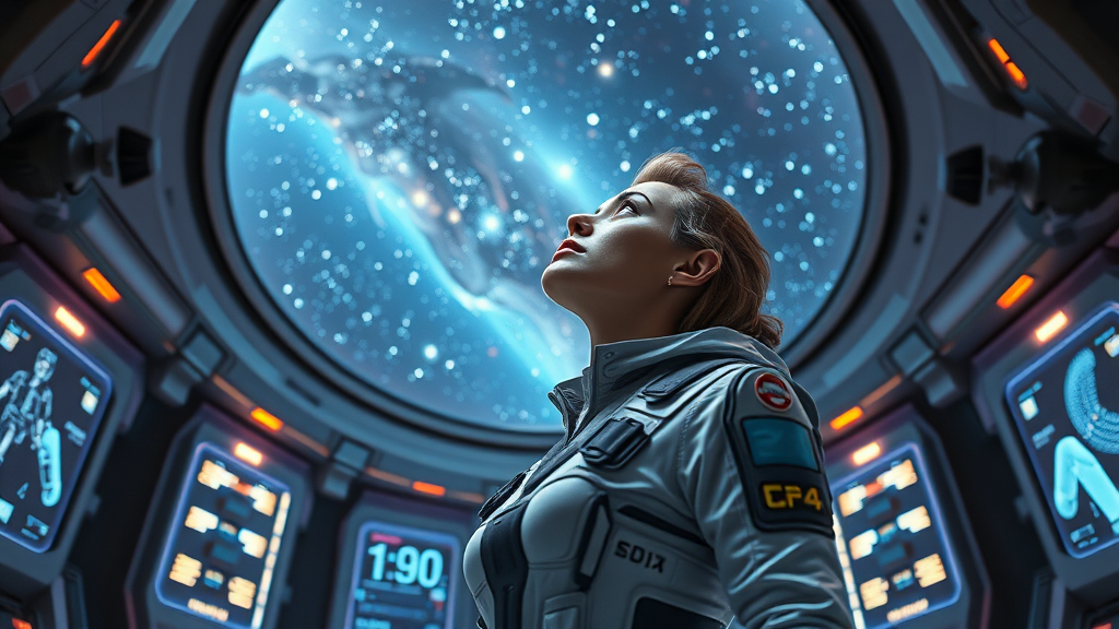 A woman gazing at the stars, dressed in a sleek flight suit, stands within a cutting-edge space station, surrounded by holographic displays and glowing panels, her eyes reflecting the cosmic wonders beyond the transparent dome, an imaginative blend of hyper-realistic details and ethereal CGI effects.