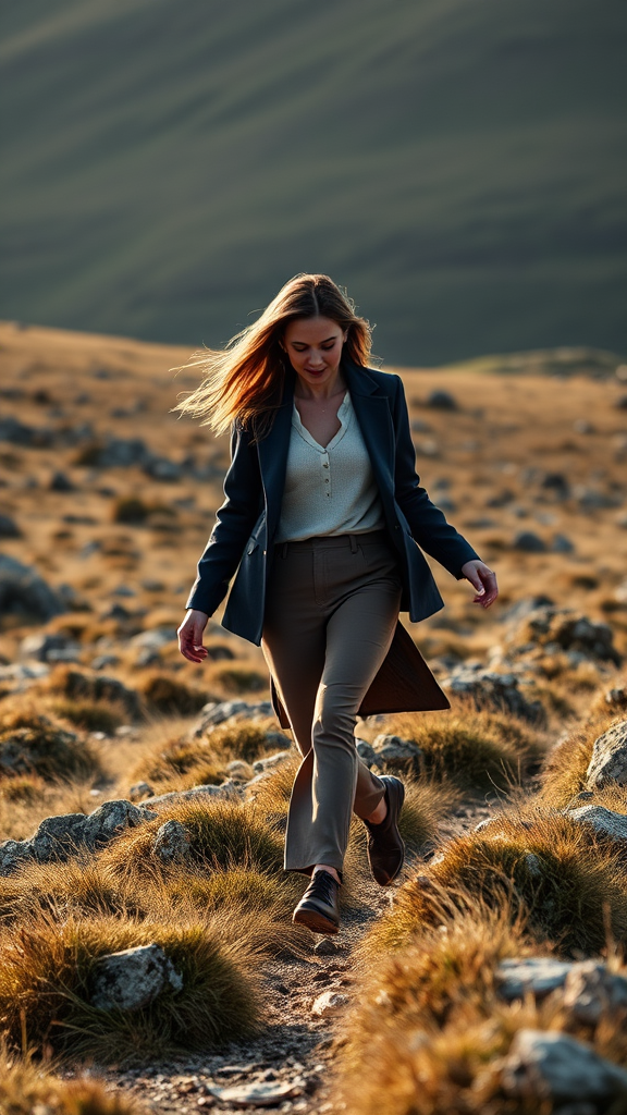 A woman gracefully exploring a rugged meadow, styled as an outdoor fashion model, bathed in the gentle glow of natural light, set against the breathtaking backdrop of Scottish highlands, adorned in a chic ensemble of light navy and rich dark brown, captured with the crystal clarity of a Sony A7III camera.