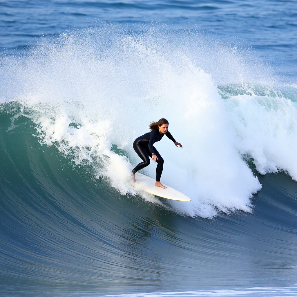 A woman gracefully glides along a crashing wave on her surfboard, demonstrating her exceptional surfing prowess. Her sleek wetsuit allows her the perfect blend of protection and mobility needed for the sport. Positioned prominently in the middle of the scene, the surfboard cuts through the water as she deftly balances, fully immersed in the exhilarating surge of the ocean.
