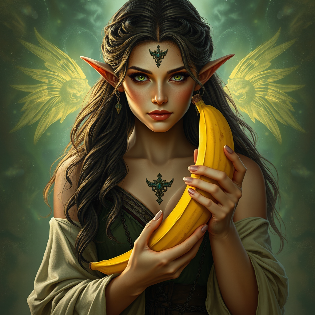 A woman gracefully holds a banana, her poised figure radiating mystical energy. She's a half-elf sorceress, an enchanting forest mage enveloped in the essence of nature. Her striking features reflect the wisdom of an elfic priestess, captured in an intricately detailed matte fantasy portrait. This epic fantasy art piece draws inspiration from Magali Villeneuve and Leona Wood, portraying a female druid with an aura of ethereal serenity. The symmetrical composition highlights her enigmatic presence, as if she's a revered character in a captivating fantasy RPG.